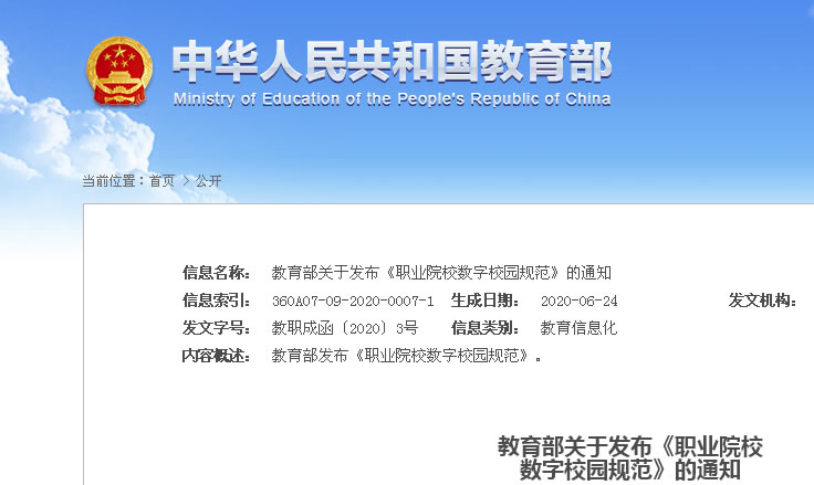 教育部关于发布《职业院校数字校园规范》的通知教职成函〔2020〕3号各省、自治区、直辖市教育厅(教委),各计划单列市教育局,新疆生产建设兵团教育局:为贯彻落实全国教育大会精神,...