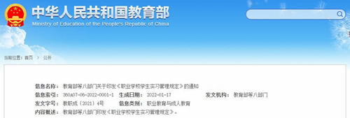 教育部等八部门联合印发《职业学校学生实习管理规定》(2021年修订)实习是职业教育重要的教学环节,既是专业学习和技术技能训练的必备途径,也是锤炼意志品质、提前熟悉岗位、引导融入社会的重要方式,必须高度重视、规范管理。日前,教育部联合工业和信息化部等八部门深入分析数字经济...