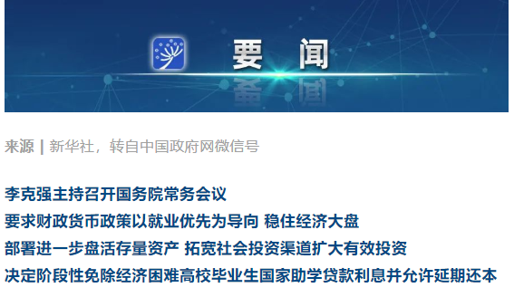 李克强主持召开国务院常务会议决定阶段性免除经济困难高校毕业生国家助学贷款利息并允许延期还本等李克强主持召开国务院常务会议要求财政货币政策以就业优先为导向稳住经济大盘部署进一步盘活存量资产拓宽社会投资渠道扩大有效投资决定阶段性免除经济困难高校毕业生国家助学贷款利息并